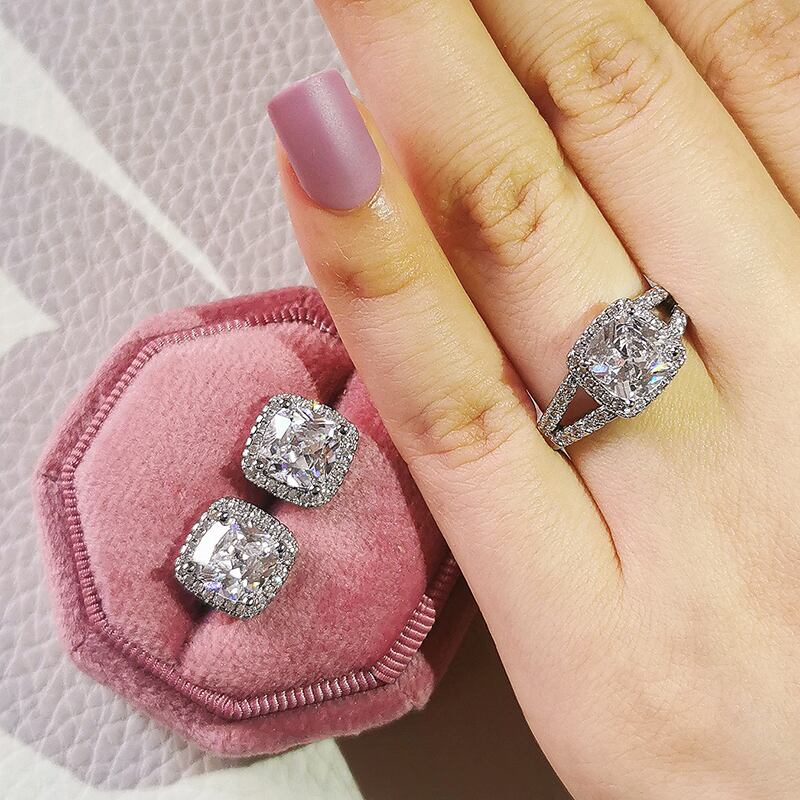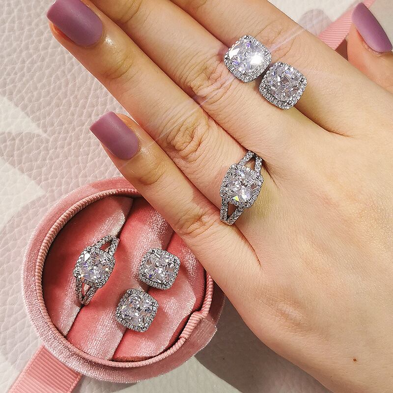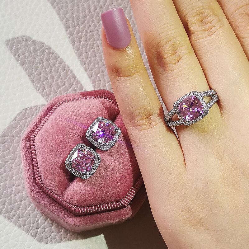 送料無料 2ピースパックシルバーカラー花嫁ジュエリーセットハロー婚約指輪ラウンドスタッドピアスウェディングJ4935-ピンク イヤリング リング 銀 アクセサリー AE00116624360863554