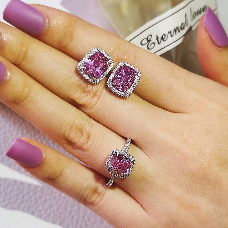 送料無料 2ピースパックリアルシルバーカラー花嫁ジルコンジュエリーセット婚約指輪スタッドピアスウェディングクリスマスギフトJ6017-ピンク イヤリング リング 銀 アクセサリー AE00116676309189036