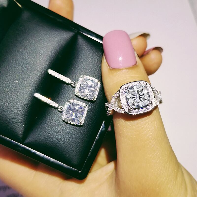 送料無料 2ピースパックシルバーカラー花嫁ジュエリーセットハロー婚約指輪ラウンドスタッドピアスウェディングJ4937 イヤリング リング 銀 アクセサリー AE00116635549573991
