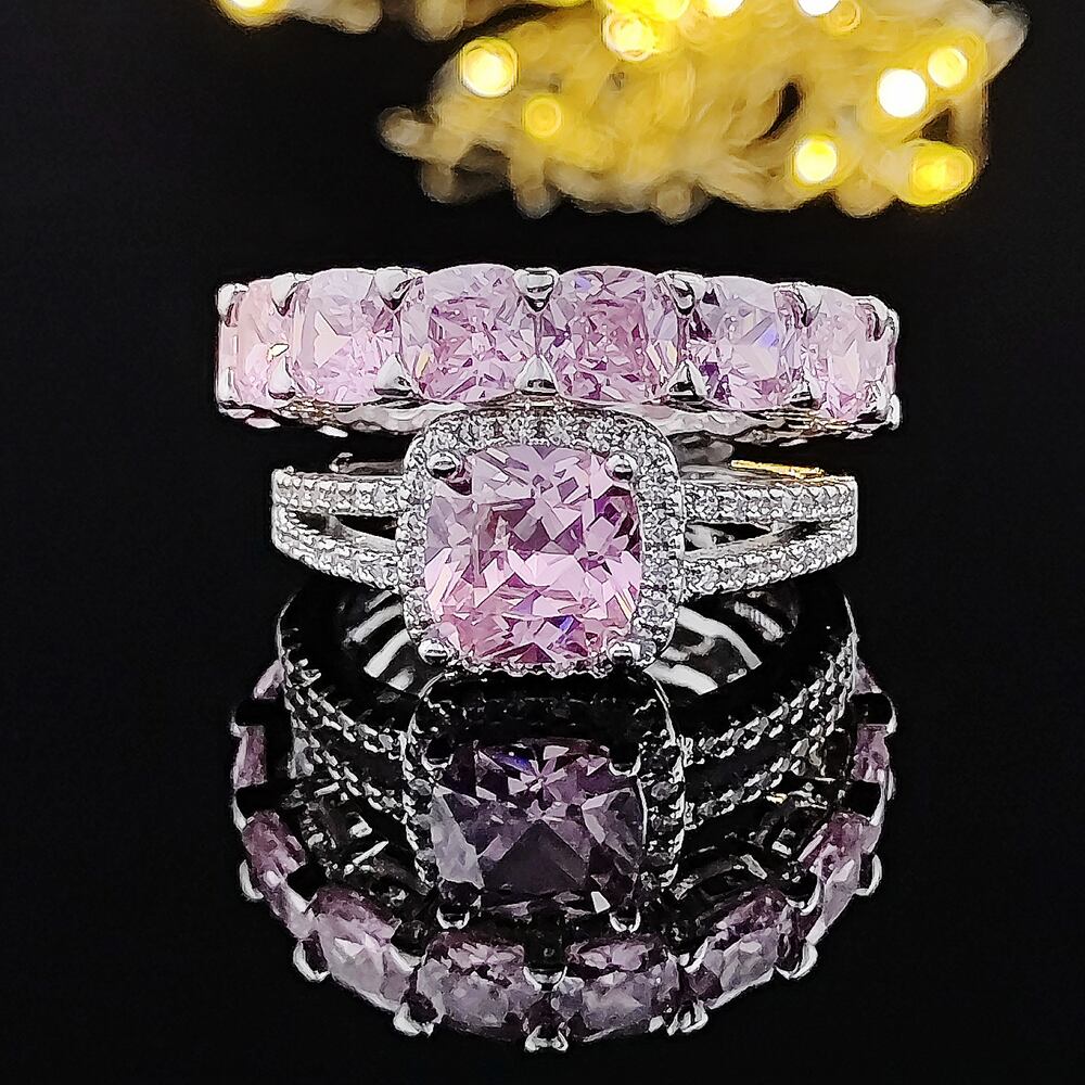 送料無料 2022シルバーカラー花嫁クッションカットフィンガーリングセット女性ジュエリーピュアウェディングエンゲージリングパーソナライズR6245 指輪 銀 アクセサリー AE00116677963393160