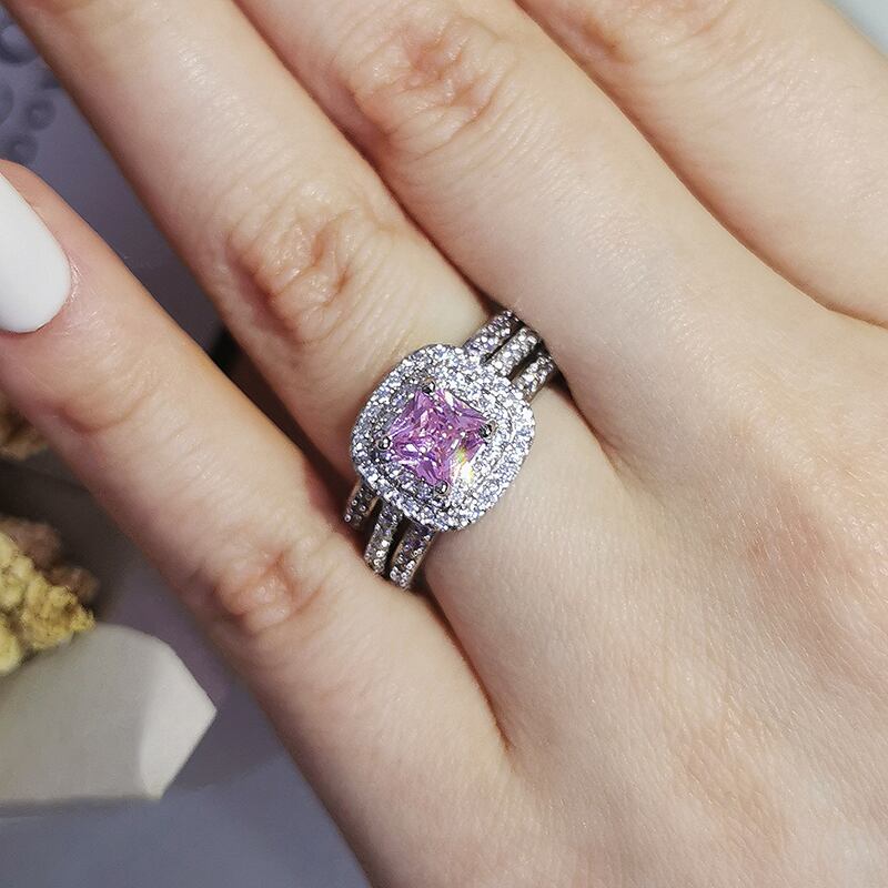 送料無料 2022シルバーカラー花嫁クッションカットフィンガーリングセット女性ジュエリーピュアウェディングエンゲージリングパーソナライズR6971 指輪 銀 アクセサリー AE0011665290186740