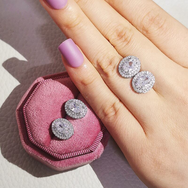 送料無料 2ピースパックシルバーカラー花嫁ジュエリーセットハロー婚約指輪ラウンドスタッドピアスウェディングJ6372 イヤリング リング 銀 アクセサリー AE00116626669820205