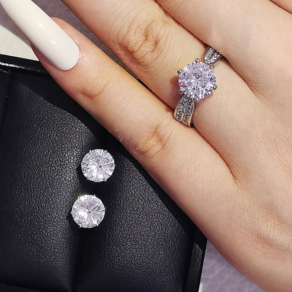 送料無料 2ピースパックシルバーカラー花嫁ジュエリーセットハロー婚約指輪ラウンドスタッドピアス結婚式の女性J4914 イヤリング リング 銀 アクセサリー AE00116669580673488