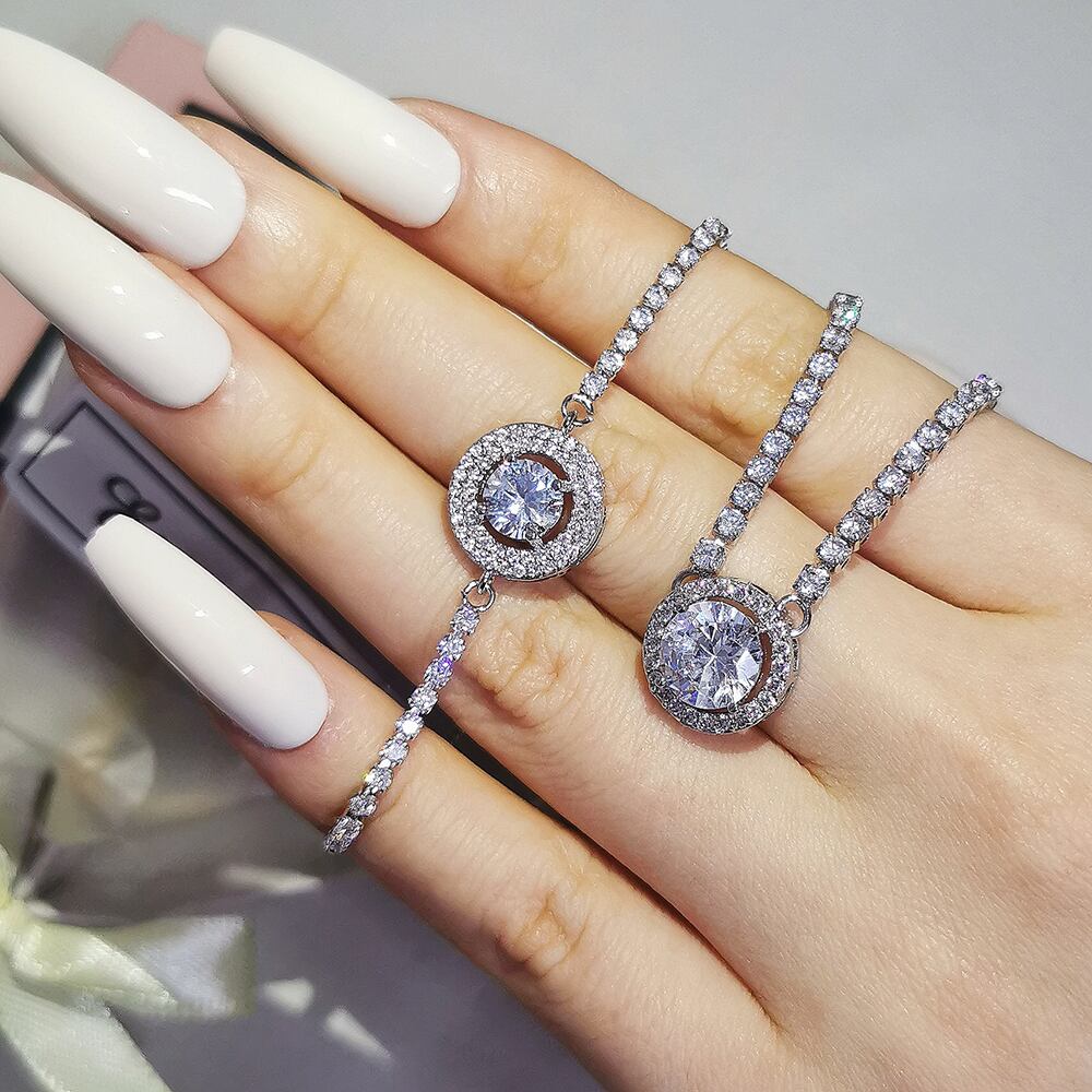 送料無料 2ピースパックシルバーカラー花嫁ジュエリーセットハロー婚約指輪ラウンドスタッドピアスウェディングJ7275 イヤリング リング 銀 アクセサリー AE00116671636203902