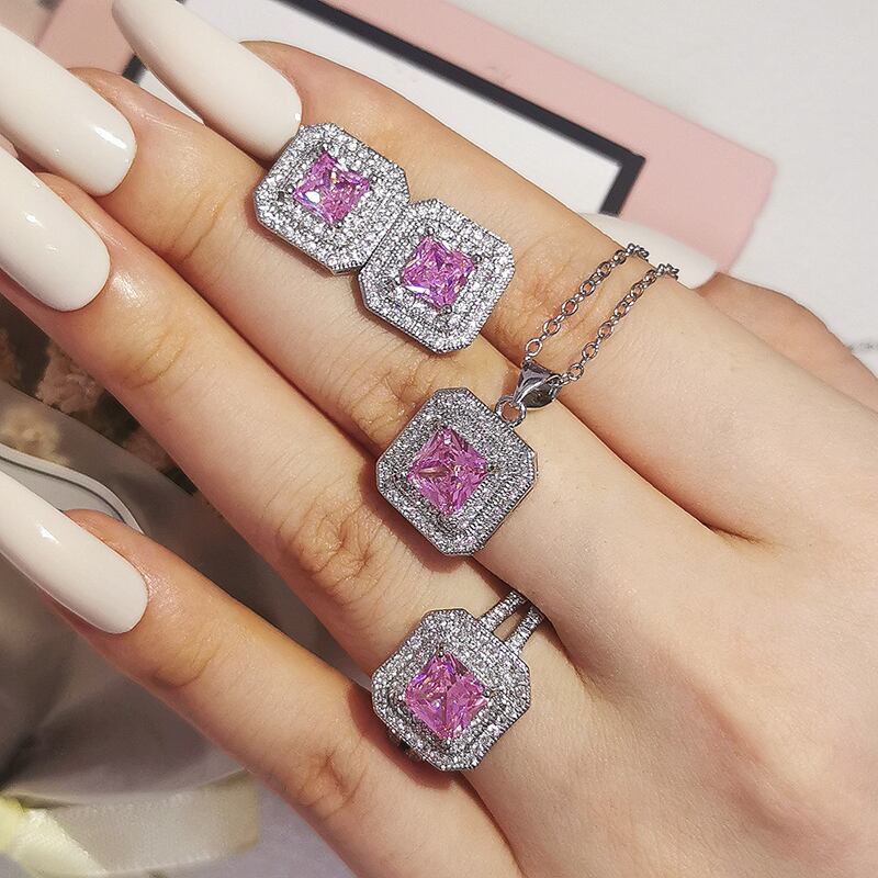 送料無料 3ピースパックシルバーカラー花嫁ジュエリーエンゲージメント4色ウェディングブライダルリングとイヤリングアフリカンJ1471-ピンク 指輪 銀 アクセサリー AE00116673136912941