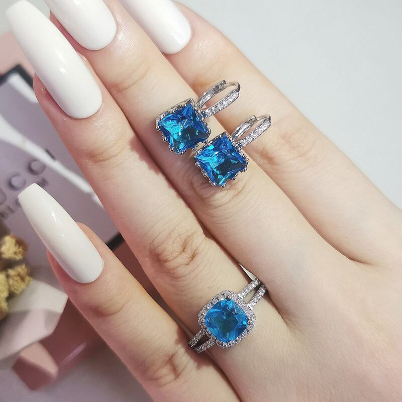 送料無料 2022年トレンディなブルーシルバーカラー花嫁ドバイジュエリーセットイヤリングリング女性の結婚式のクリスマスパーティーギフトJ6718 指輪 銀 アクセサリー AE00116630890975907