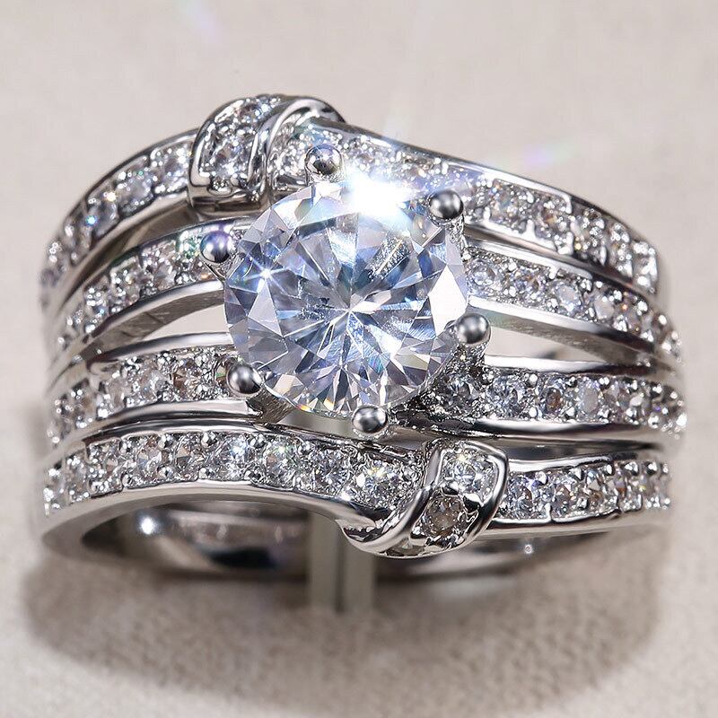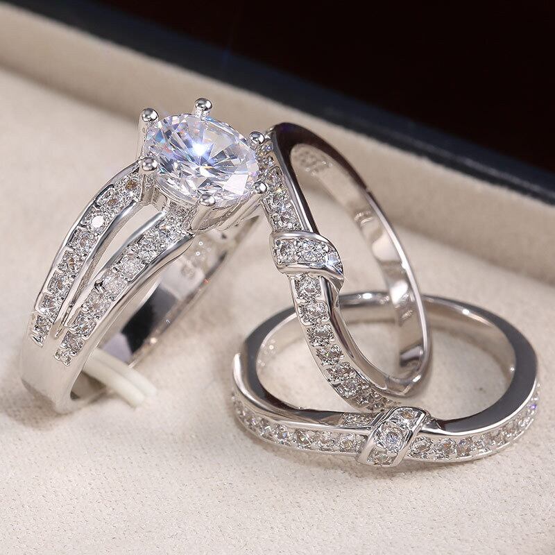 送料無料 ホットラグジュアリーラウンドシルバーカラー花嫁3PCS結婚指輪セット女性レディアニバーサリーギフトジュエリーR5863 リング 銀 アクセサリー AE00116657657326850