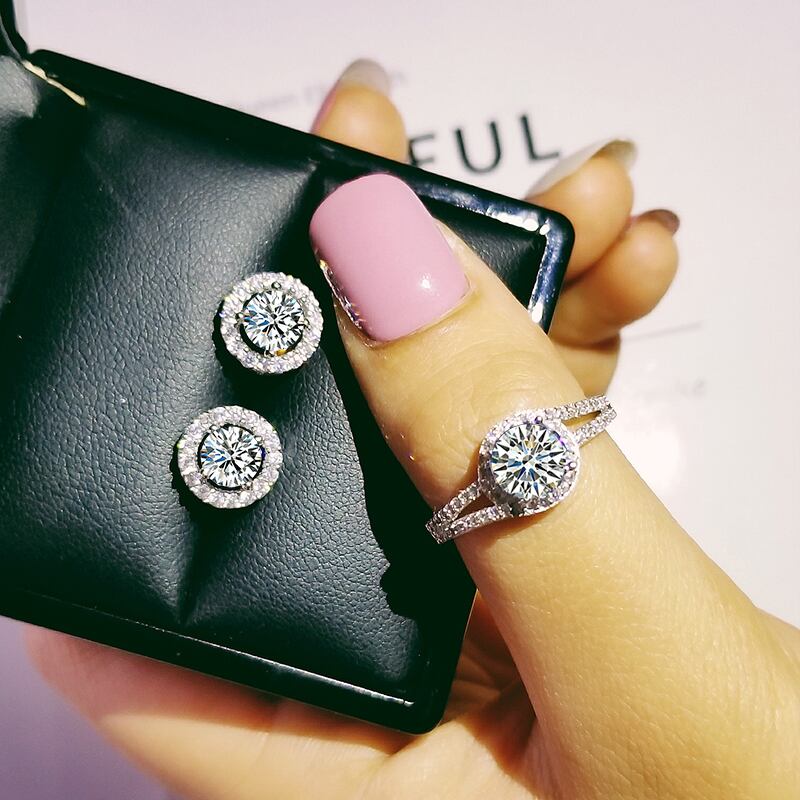 送料無料 2ピースパックシルバーカラー花嫁ジュエリーセットハロー婚約指輪ラウンドスタッドピアスウェディングギフトジュエリーセット女性J4932 イヤリング リング 銀 アクセサリー AE0011665007118243