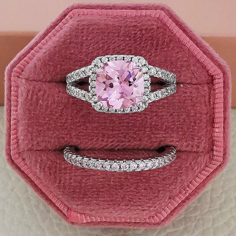 送料無料 2ピースパックシルバーカラー花嫁ジュエリーセットハロー婚約指輪ラウンドスタッドピアスウェディングJ7000-ピンク イヤリング リング 銀 アクセサリー AE00116617108937732