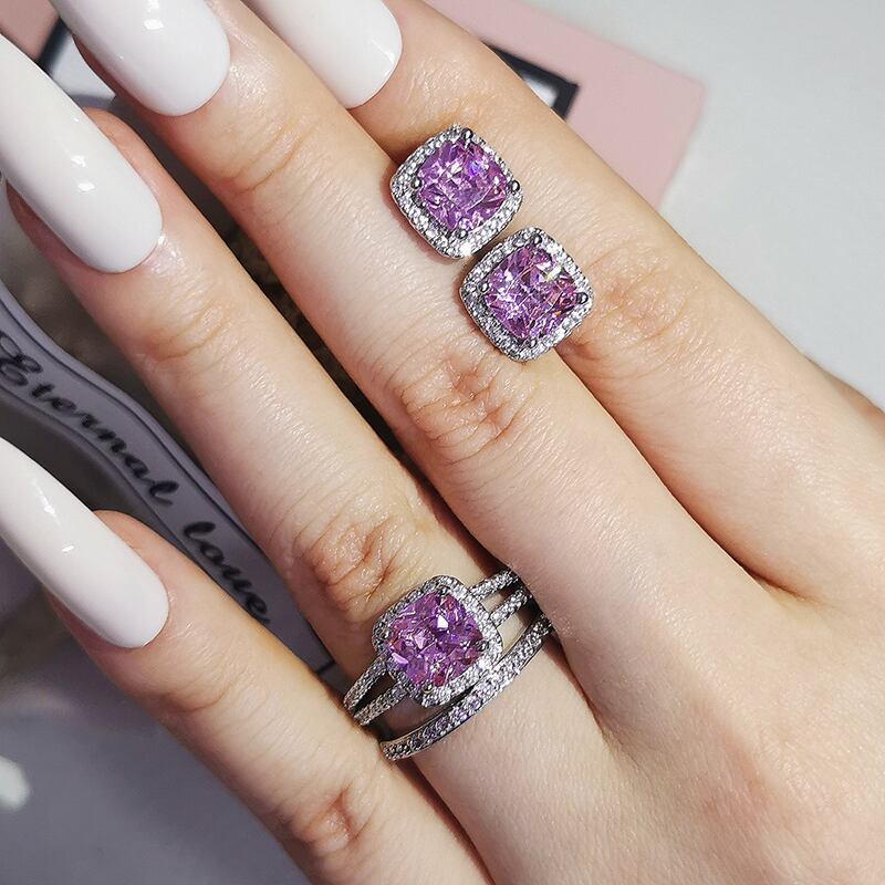 送料無料 2ピースパックシルバーカラー花嫁ジュエリーセットハロー婚約指輪ラウンドスタッドピアスウェディングJ6992-ピンク イヤリング リング 銀 アクセサリー AE00116657868534754