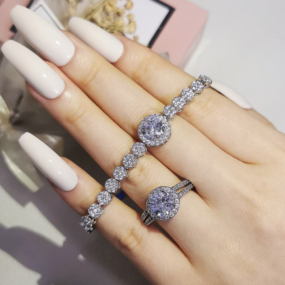 送料無料 2ピースパックシルバーカラー花嫁ジュエリーセットハロー婚約指輪ラウンドスタッドピアスウェディングJ7265 イヤリング リング 銀 アクセサリー AE00116620694951639