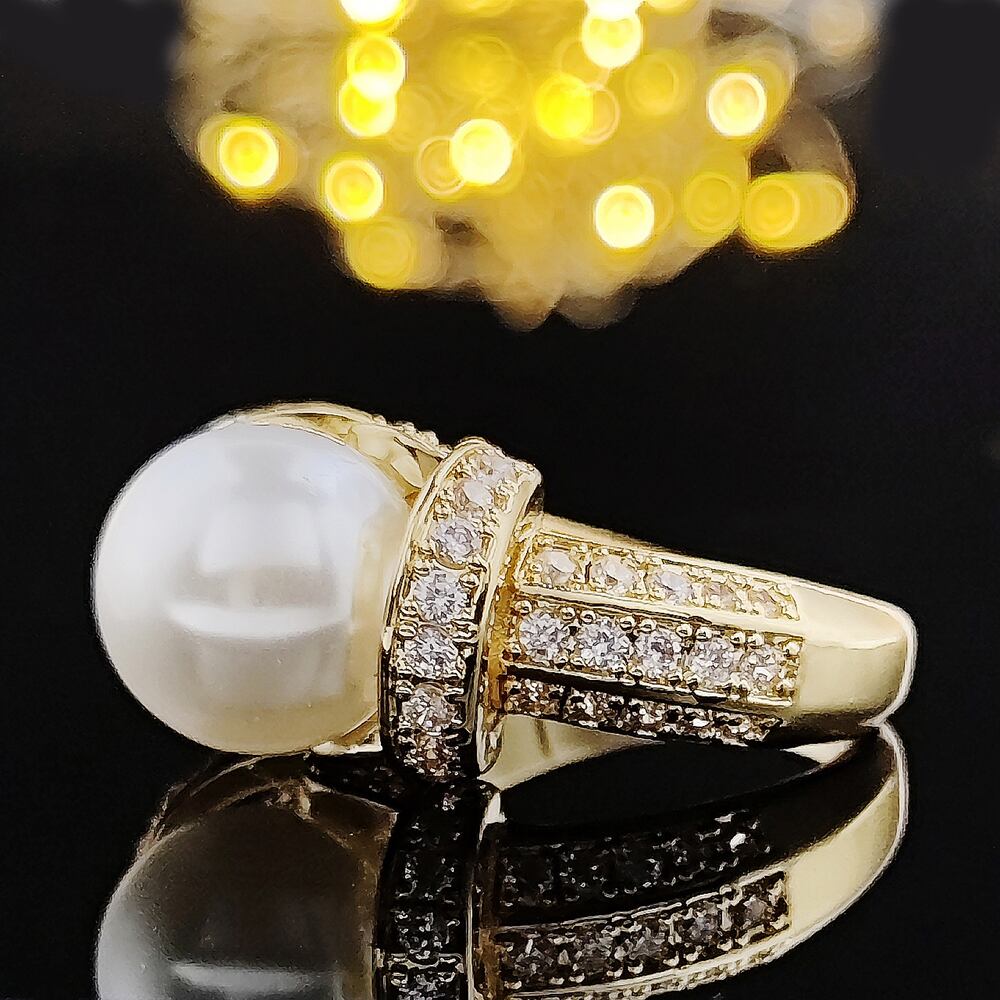 送料無料 2022ラグジュアリーゴールドカラーハローシミュレートパールエンゲージリング女性アニバーサリーギフトジュエリーR6202 指輪 真珠 人工 アクセサリー AE00116663376760701