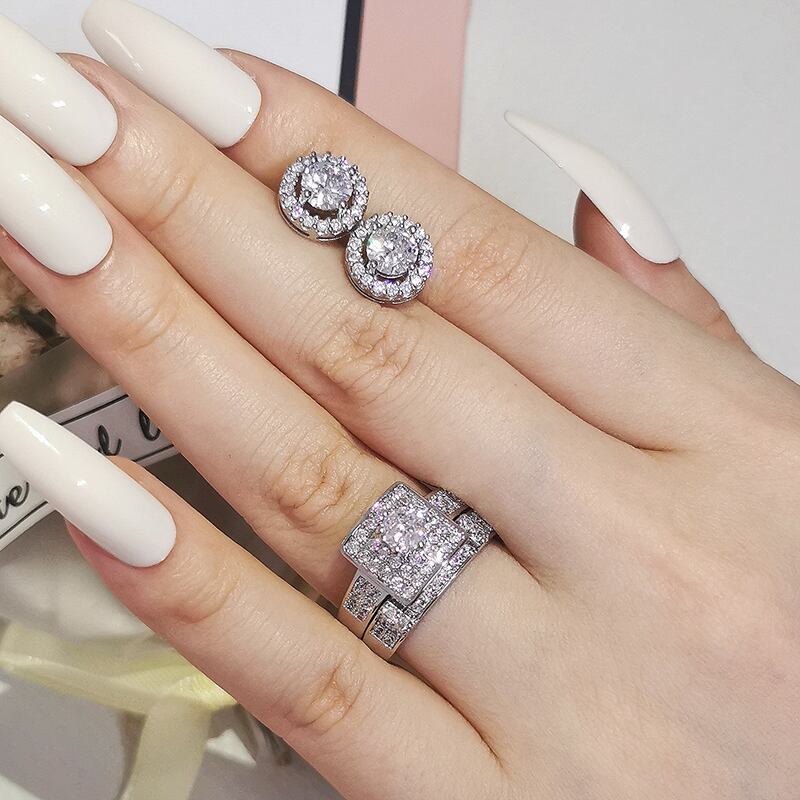 送料無料 2ピースパックシルバーカラー花嫁ジュエリーセットハロー婚約指輪ラウンドスタッドピアスウェディングギフトクリスマスJ6308 イヤリング リング 銀 アクセサリー AE00116629015211978