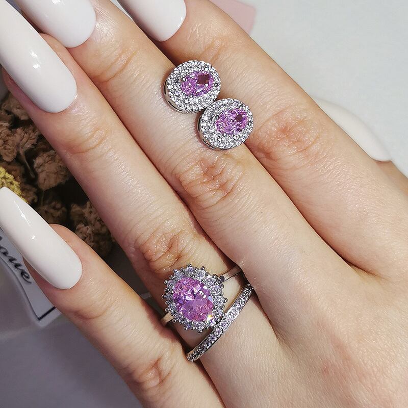 送料無料 2ピースパックシルバーカラー花嫁クッションカットジルコンジュエリーセット婚約指輪スタッドピアス女性ギフトJ7014-ピンク イヤリング リング 銀 アクセサリー AE00116663336398752