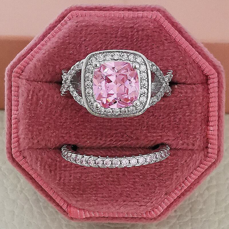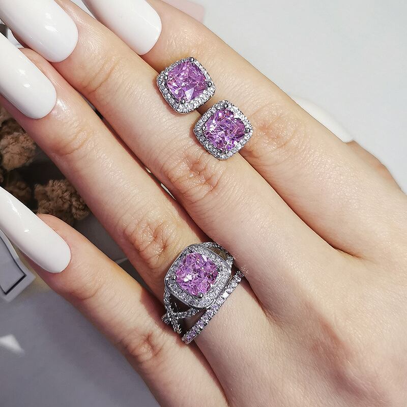 送料無料 2ピースパックシルバーカラー花嫁ジュエリーセットハロー婚約指輪ラウンドスタッドピアスウェディングギフトクリスマスJ7004-ピンク イヤリング リング 銀 アクセサリー AE00116626603375510