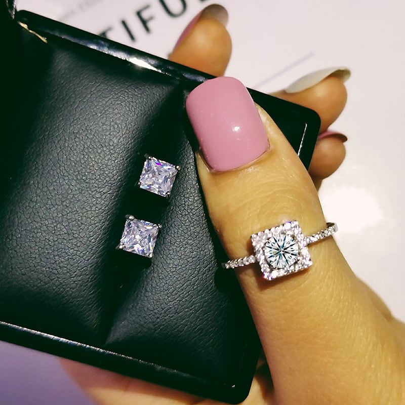 送料無料 2ピースパックシルバーカラー花嫁ジュエリーセット女性ハロー婚約指輪ラウンドスタッドピアスウェディングJ4912 イヤリング リング 銀 アクセサリー AE0011665030046587