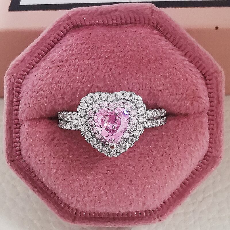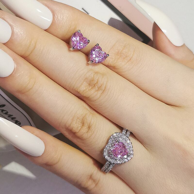 送料無料 2ピースパックシルバーカラー花嫁ジュエリーセットハロー婚約指輪ラウンドスタッドピアスウェディングJ6358-ピンク イヤリング リング 銀 アクセサリー AE00116614611372237