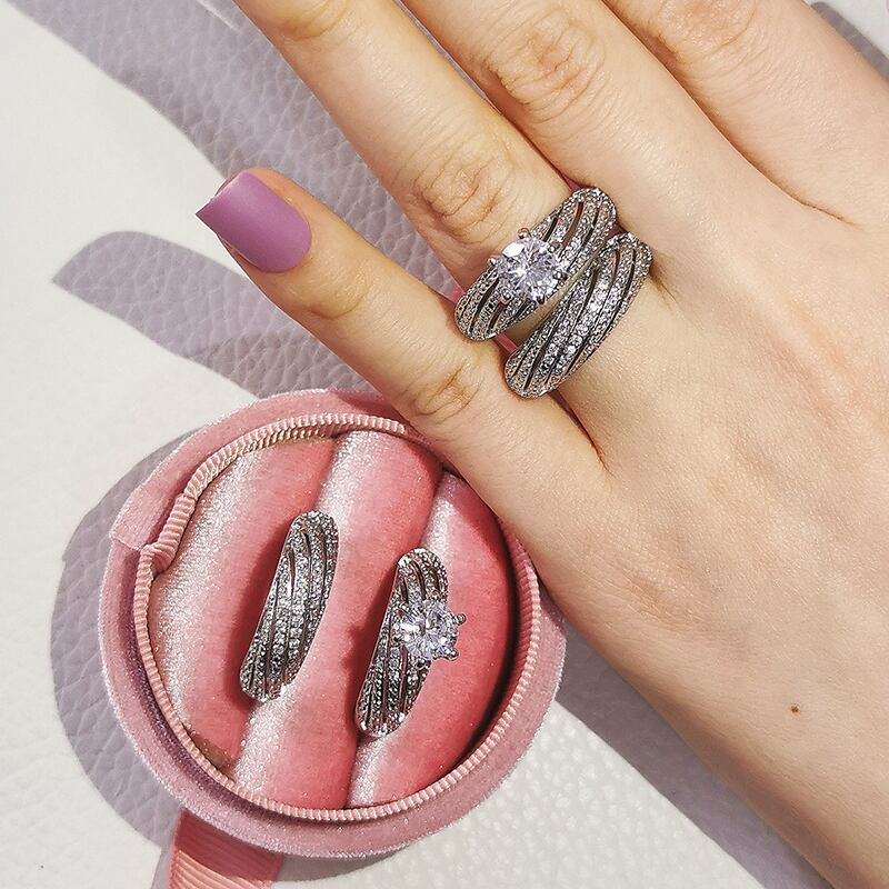 送料無料 2ピースパックシルバーカラー花嫁ジュエリーセットハロー婚約指輪ラウンドスタッドピアスウェディングギフトクリスマスJ6313 イヤリング リング 銀 アクセサリー AE0011669924025249