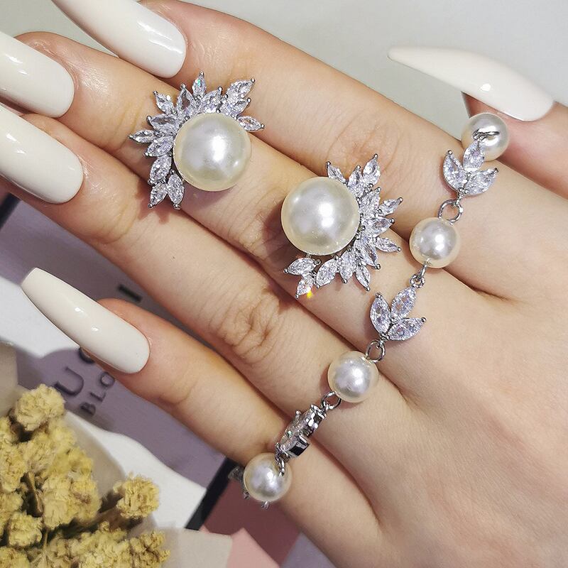 送料無料 2022高級シルバーカラー花嫁パールジュエリーセットイヤリングブレスレット女性ウェディングクリスマスパーティーギフトドバイJ6704 真珠 指輪 銀 アクセサリー AE00116647809357043