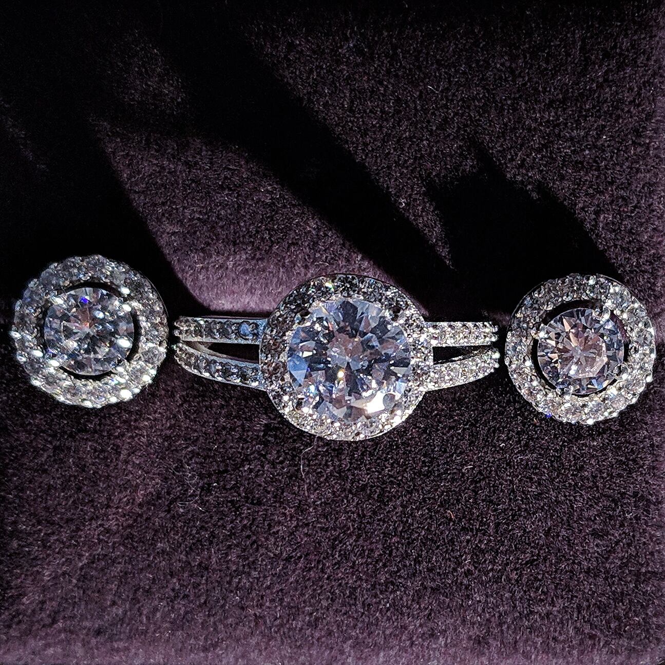 送料無料 2ピースパックシルバーカラー花嫁ジュエリーセットハロー婚約指輪ラウンドスタッドピアスウェディングJ4931 イヤリング リング 銀 アクセサリー AE0011669126999194