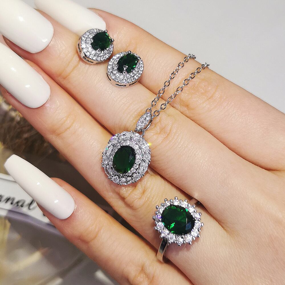 送料無料 3ピースパックグリーンカラー花嫁ジュエリーセットハロー婚約指輪ラウンドスタッドピアスウェディングギフトJ7286 イヤリング リング アクセサリー AE00116615369959641