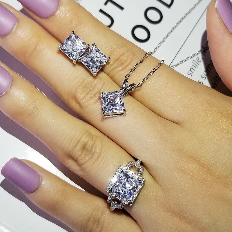 送料無料 3ピースパックシルバーカラー花嫁ジュエリーセットハロー婚約指輪ラウンドスタッドピアスウェディングバレンタインデーギフトJ5828 イヤリング リング 銀 アクセサリー AE00116676021352514