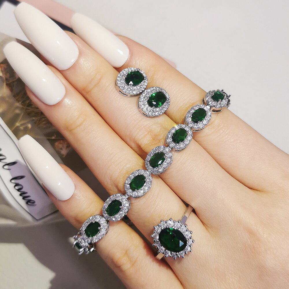 送料無料 3ピースパックグリーンカラー花嫁ジュエリーセットハロー婚約指輪ラウンドスタッドピアスウェディングギフトJ7261 イヤリング リング アクセサリー AE00116693084737311