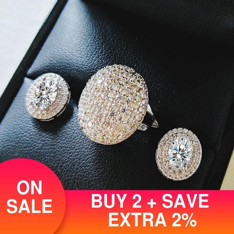 送料無料 2ピースパックシルバーカラー花嫁ジュエリーセットハロー婚約指輪ラウンドスタッドピアスウェディングパーティーJ5342 イヤリング リング 銀 アクセサリー AE00116642561557130