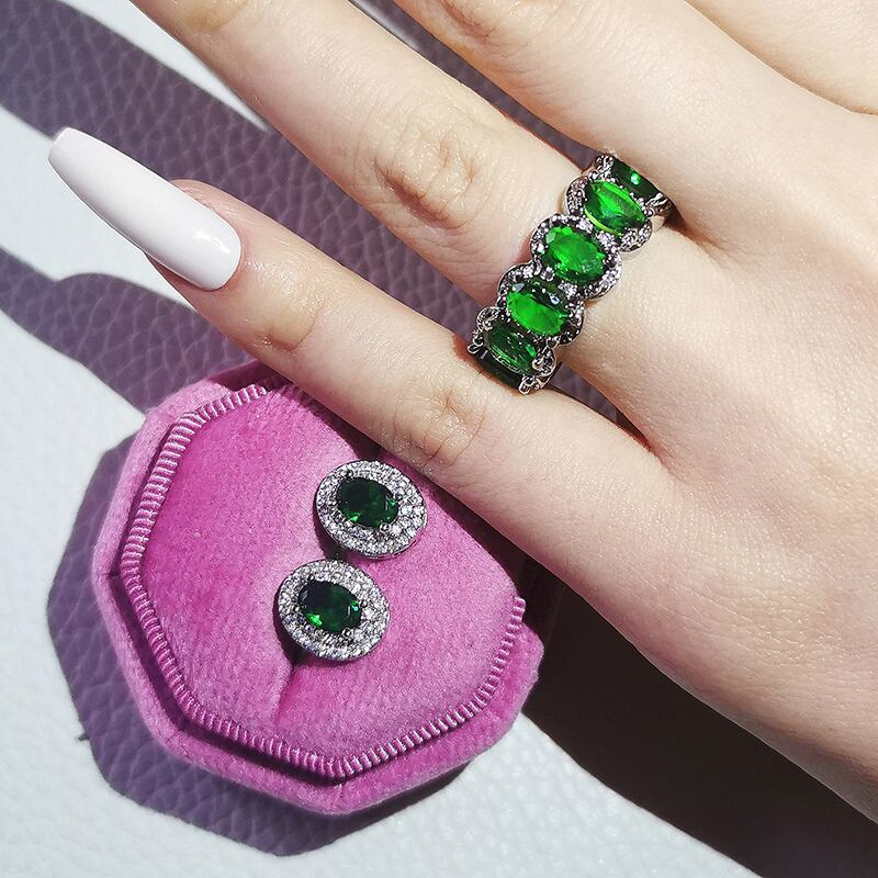 送料無料 2ピースパックシルバーカラー花嫁ジュエリーセットハロー婚約指輪ラウンドスタッドピアスウェディングギフトJ6023-GREEN イヤリング リング グリーン 銀 アクセサリー AE00116661066557495