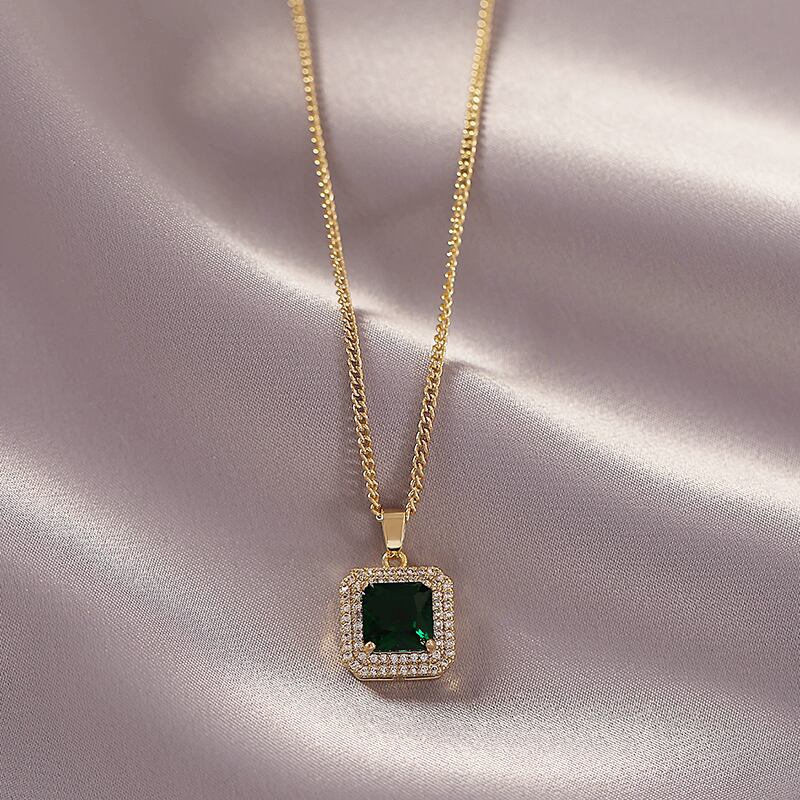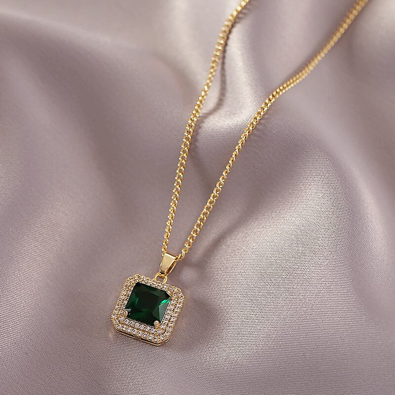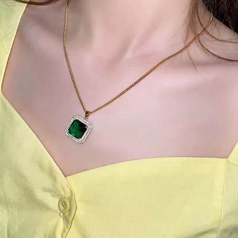 送料無料 豪華なグリーンマイクロセットジルコン幾何学的な正方形のペンダントショートネックレス女性のセクシーなネックチェーンジュエリーアクセサリー レース スクウェア アクセサリー AE7653253637870565