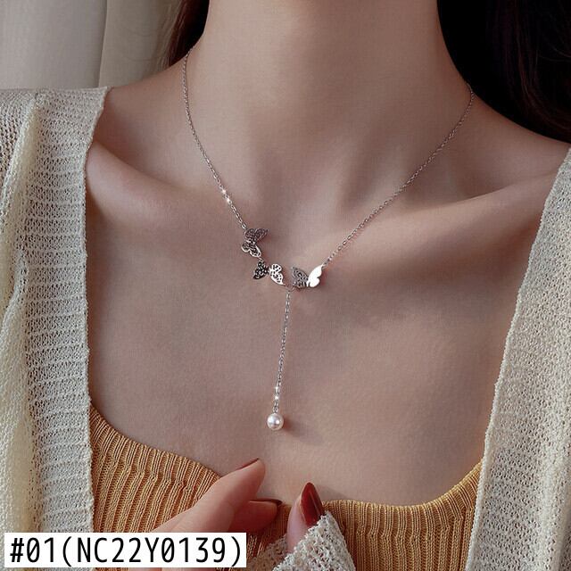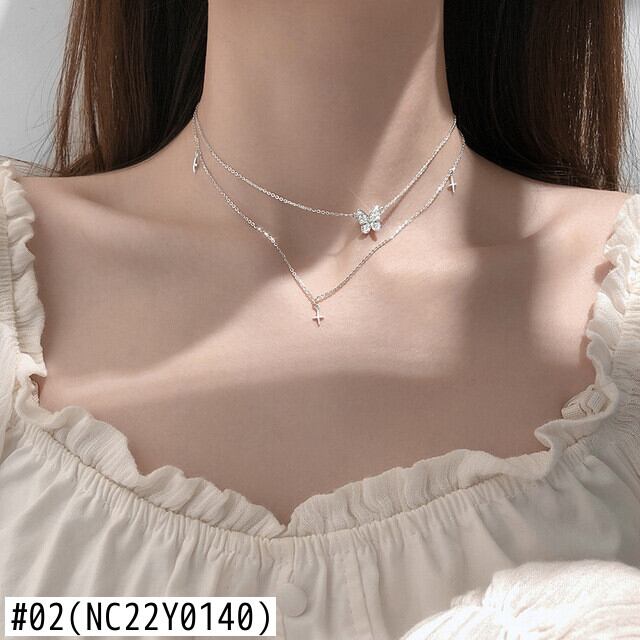 送料無料 シルバーカラーダブルレイヤーバタフライクロスクラビクルネックレスレディーススタイルジルコンパールテルチェーンネックレスジュエリー レース 真珠 銀 アクセサリー AE1332221632618461889