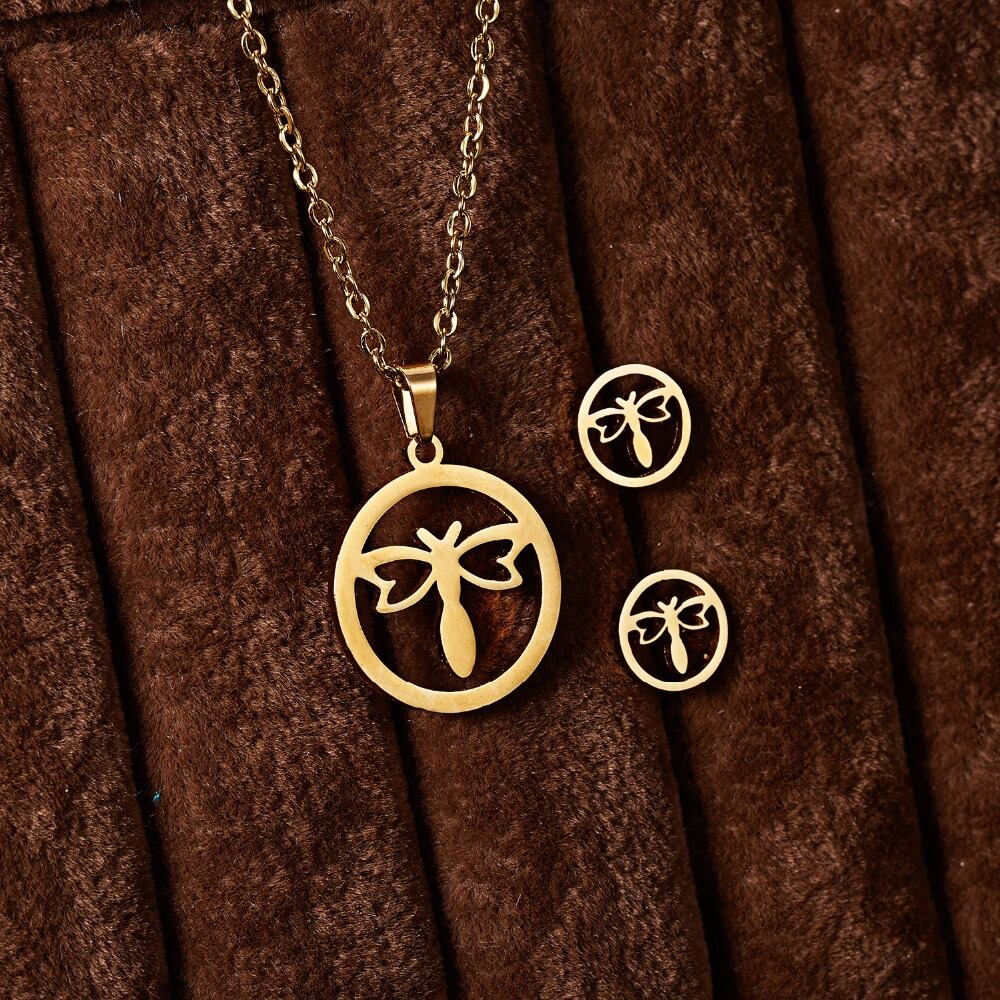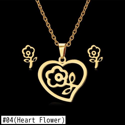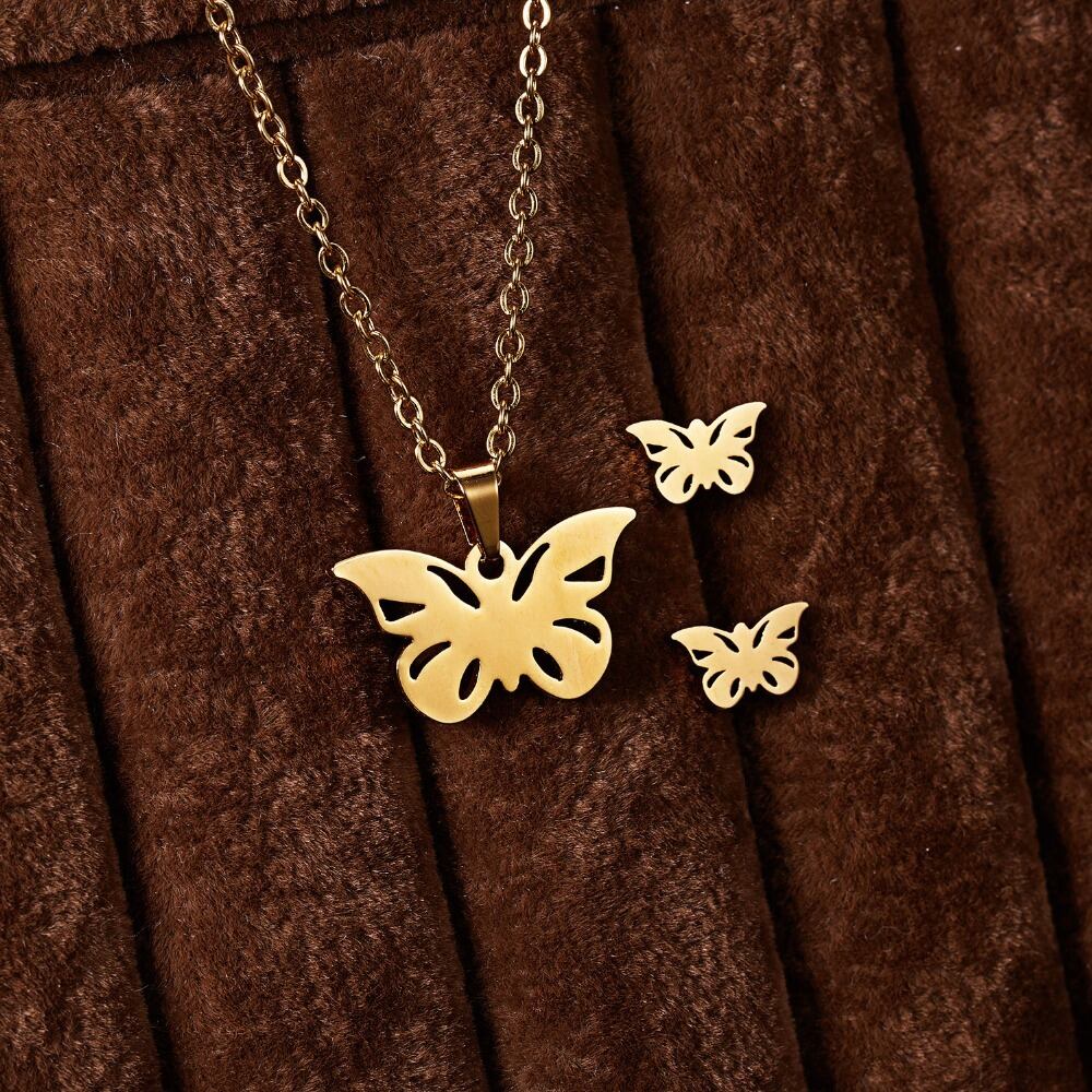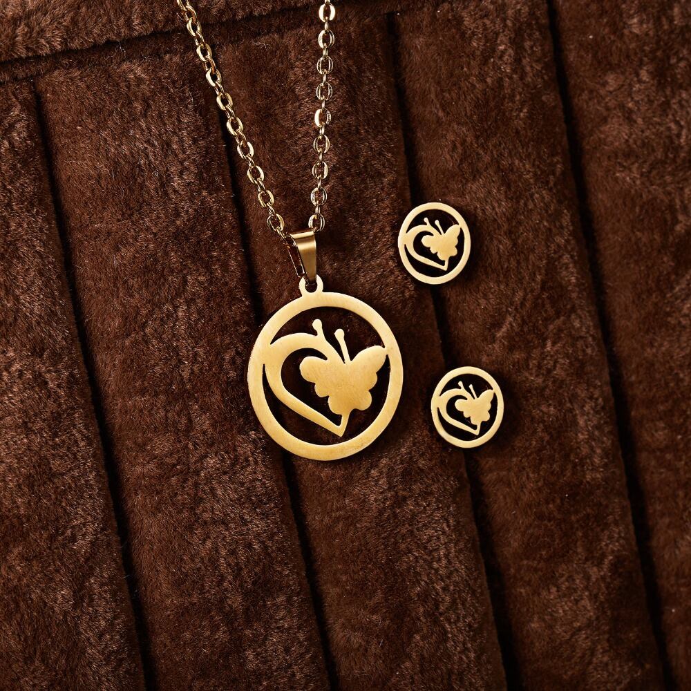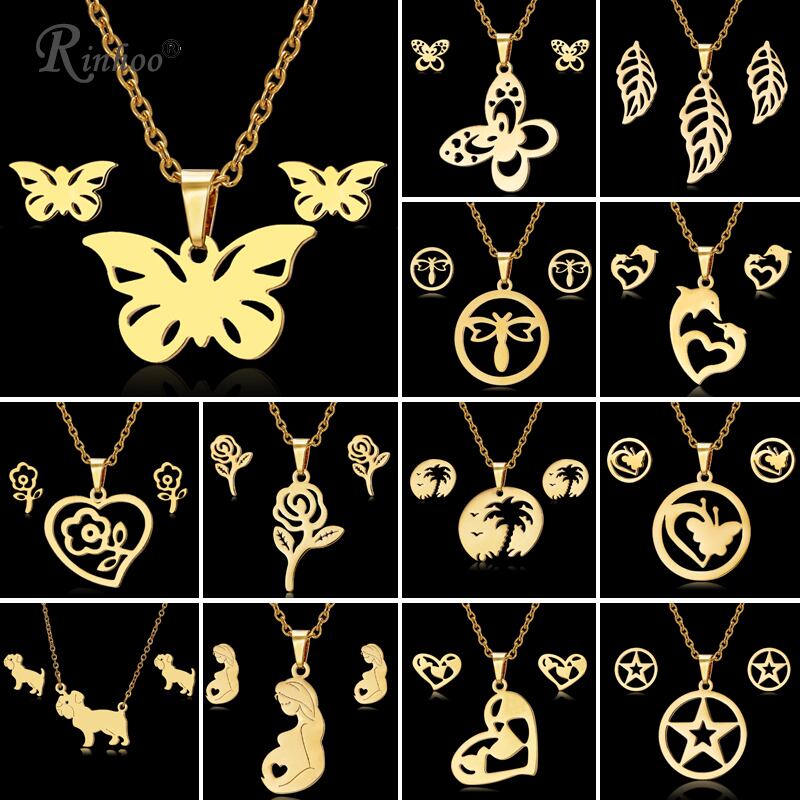 送料無料 RINHOOバタフライローズフラワーハートリーフゴールドカラーステンレススチールセットレディースネックレスイヤリングジュエリーセットウェディングジュエリー レース 指輪 フラワーデザイン アクセサリー AE1332221699537560671