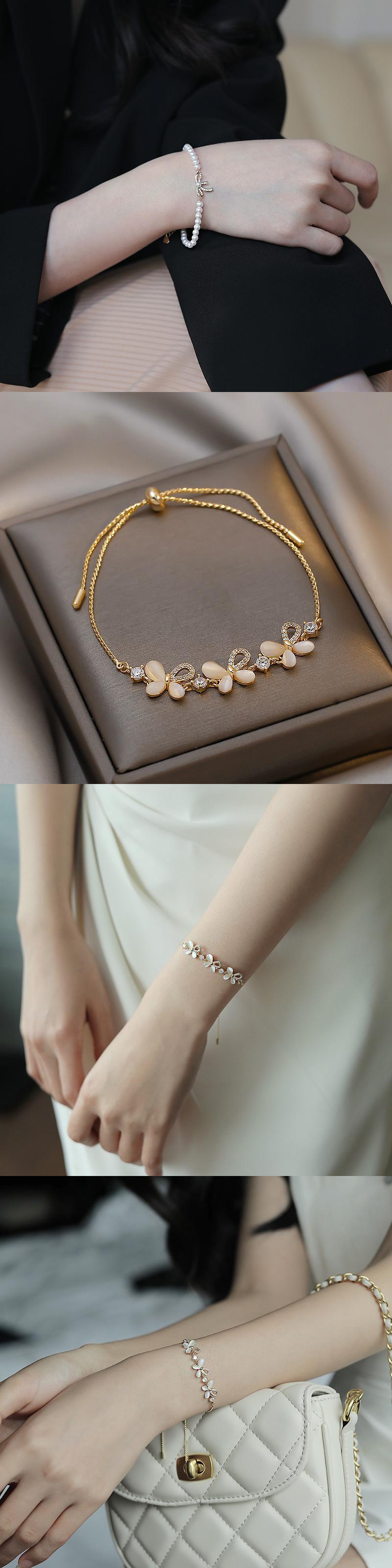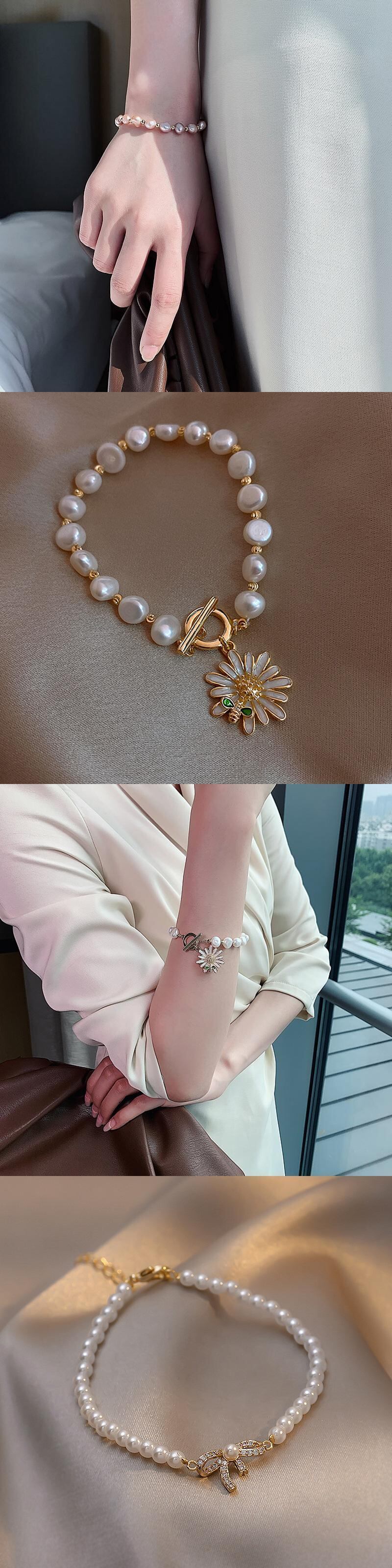 送料無料 イミテーションパールビーズブレスレットカッパージルコンヒマワリボウノットペンダントアジャスタブルチェーンブレスレット女性 リボン 真珠 フラワーデザイン アクセサリー AE1332221645645367730