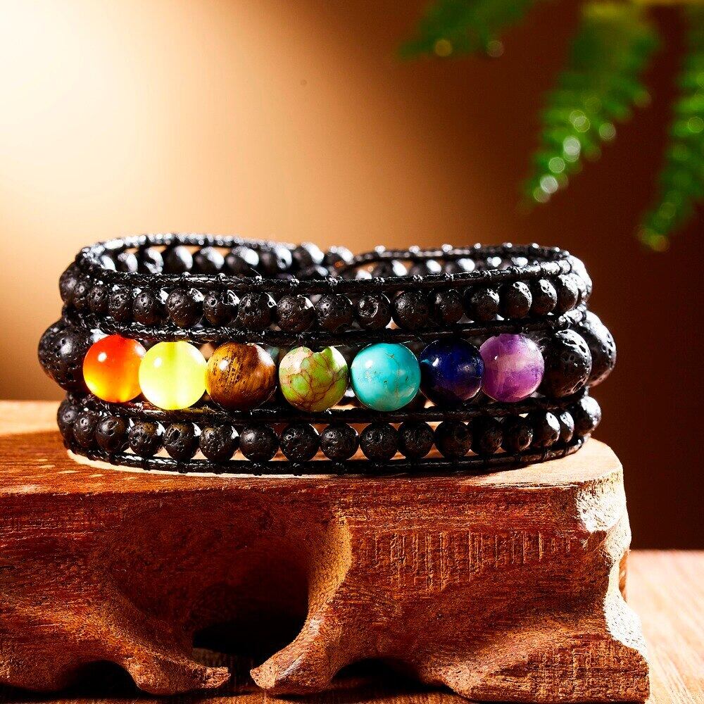 送料無料 ブラック溶岩ストーンブレスレットジュエリーハンドメイド7チャクララップブレスレットナチュラルストーンブレスレット3ストランドロープウーブンブレスレット 天然 アクセサリー AE1332221684484298430