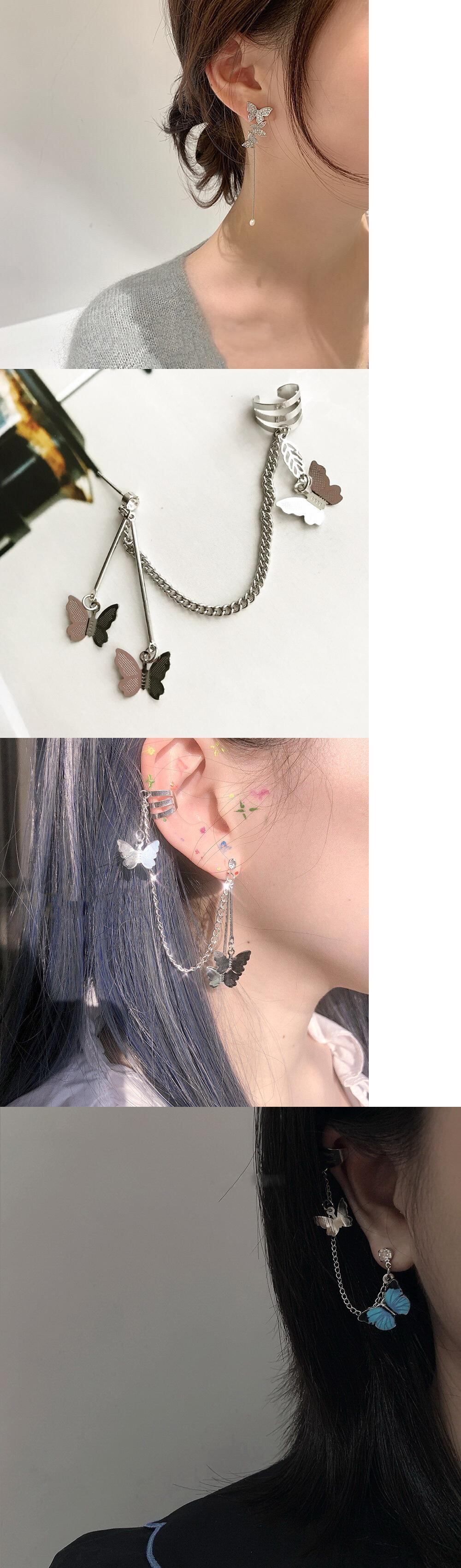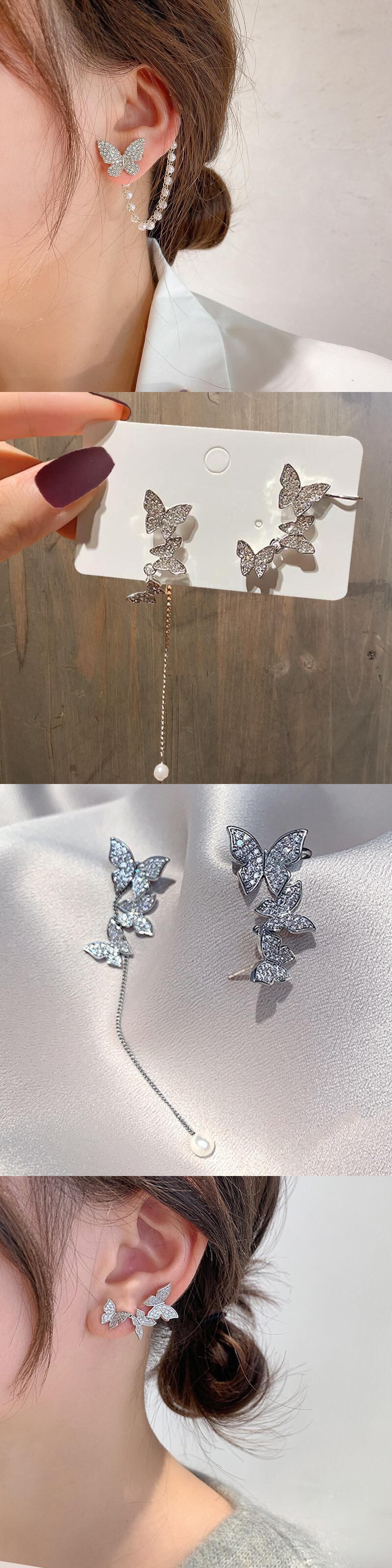 送料無料 非対称バタフライラインストーンイヤリング女性イミテーションパールチェーンイヤリングチャームジュエリーギフト 真珠 アクセサリー AE1332221679565486886