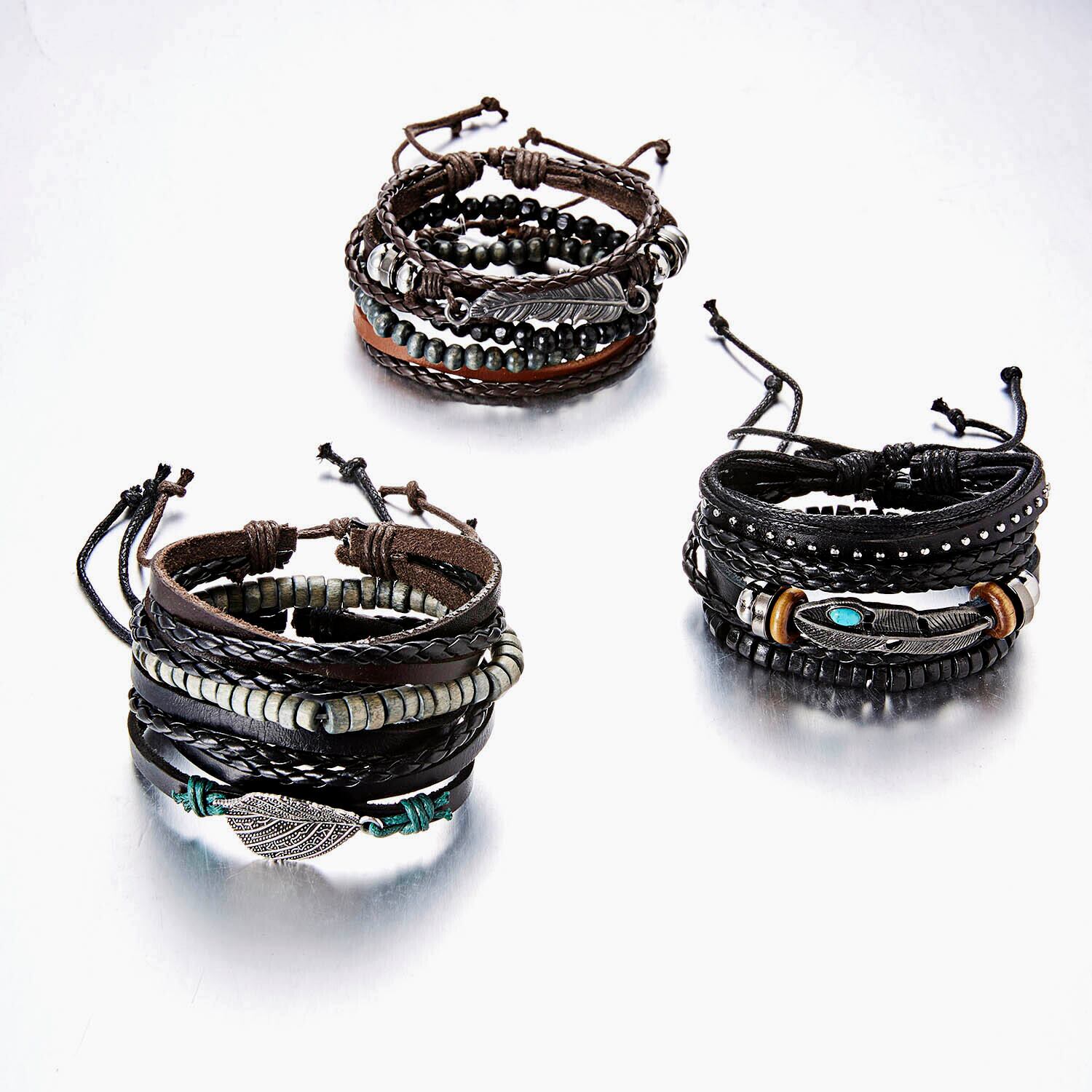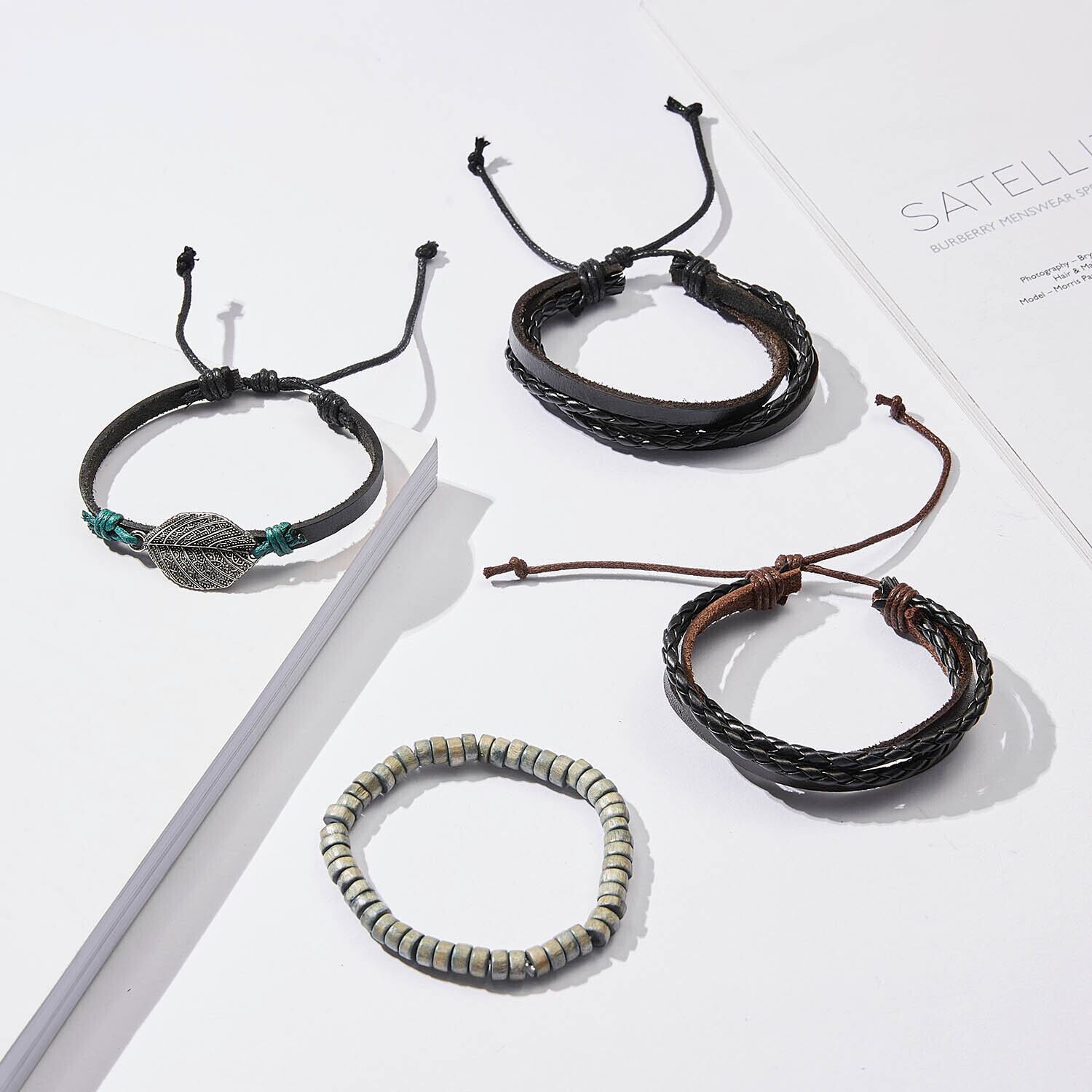 送料無料 3個/セット多層レザーブレスレットセットメンズレディースチャームリーフフェザーストーンウッドビーズラップブレスレットPulseras アクセサリー AE1332221675492395570