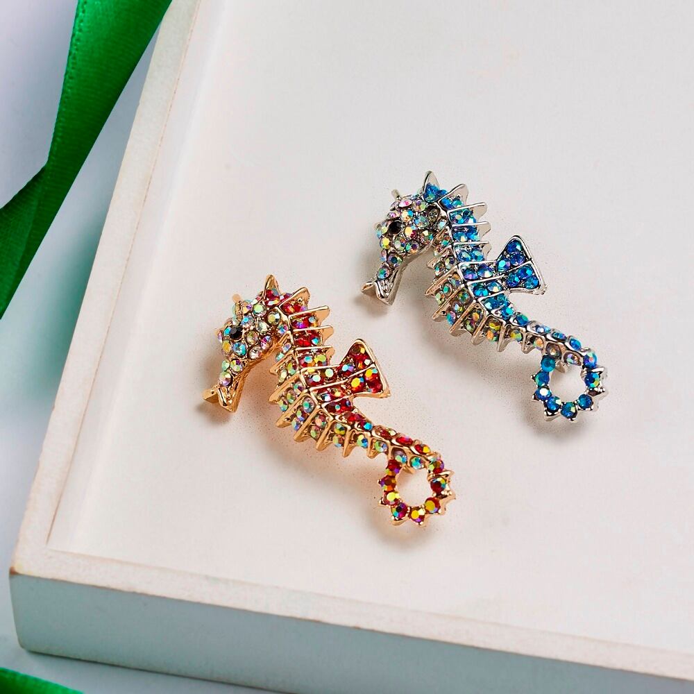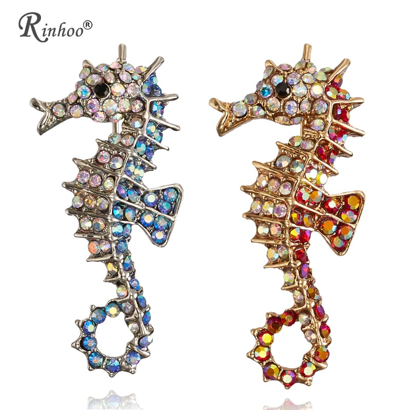 送料無料 RINHOOアニマルブローチデコレーションガーメントコサージュラインストーン赤青タツノオトシゴ水泳海馬ブローチ女性男性ジュエリーピン レッド ブルー アクセサリー AE133222168287938038