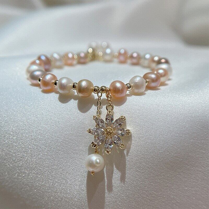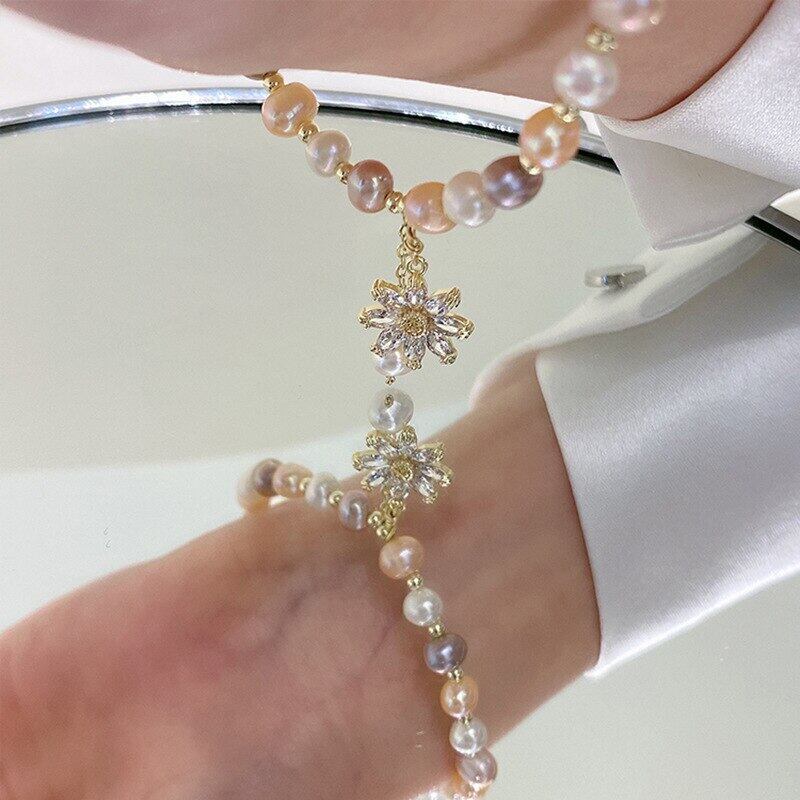 送料無料 ナチュラルバロックパールジルコンフラワーブレスレットレディースアクセサリーアジャスタブルチェーンブレスレットジュエリー 真珠 フラワーデザイン 天然 アクセサリー AE1332221645624682211