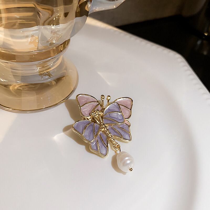 送料無料 レトロピンクパープル2バタフライパールブローチ女性シンプルアニマルピンバンケットウェディングブーケブローチジュエリーギフト 真珠 アクセサリー AE1332221669033779782