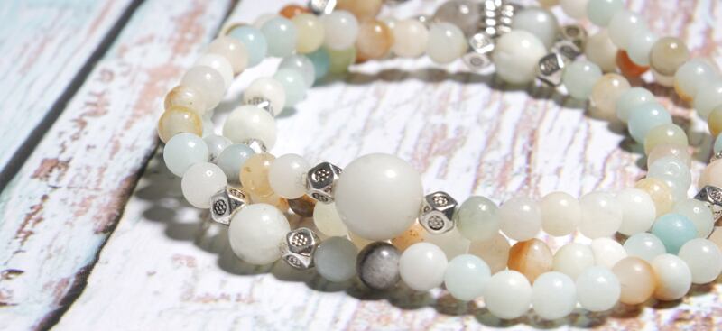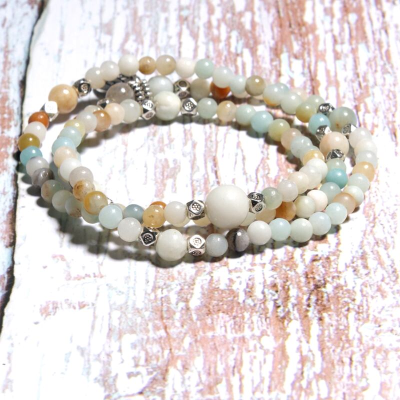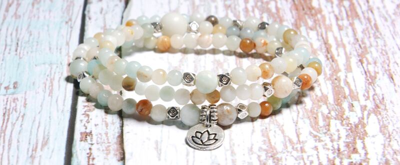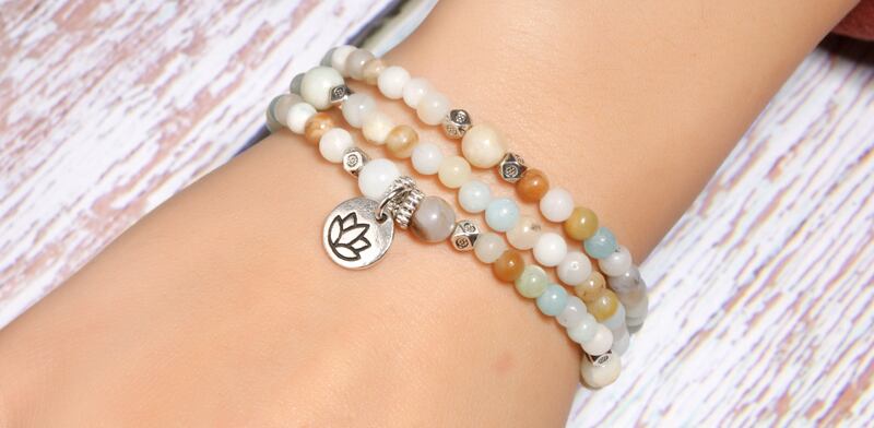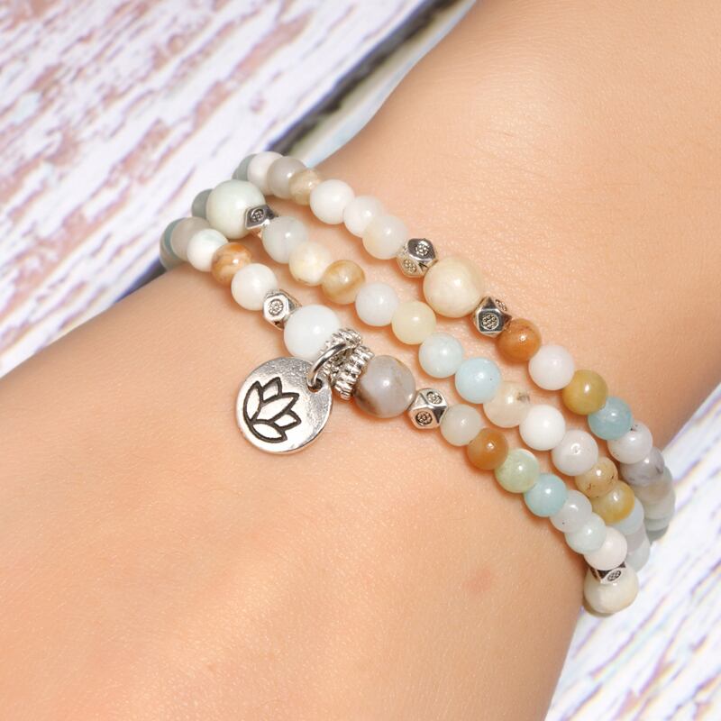 送料無料 マラビーズマントララップブレスレットヨガ4MMアマゾナイトストーンストレッチロータスチャームブレスレット女性 アクセサリー AE665553416835510