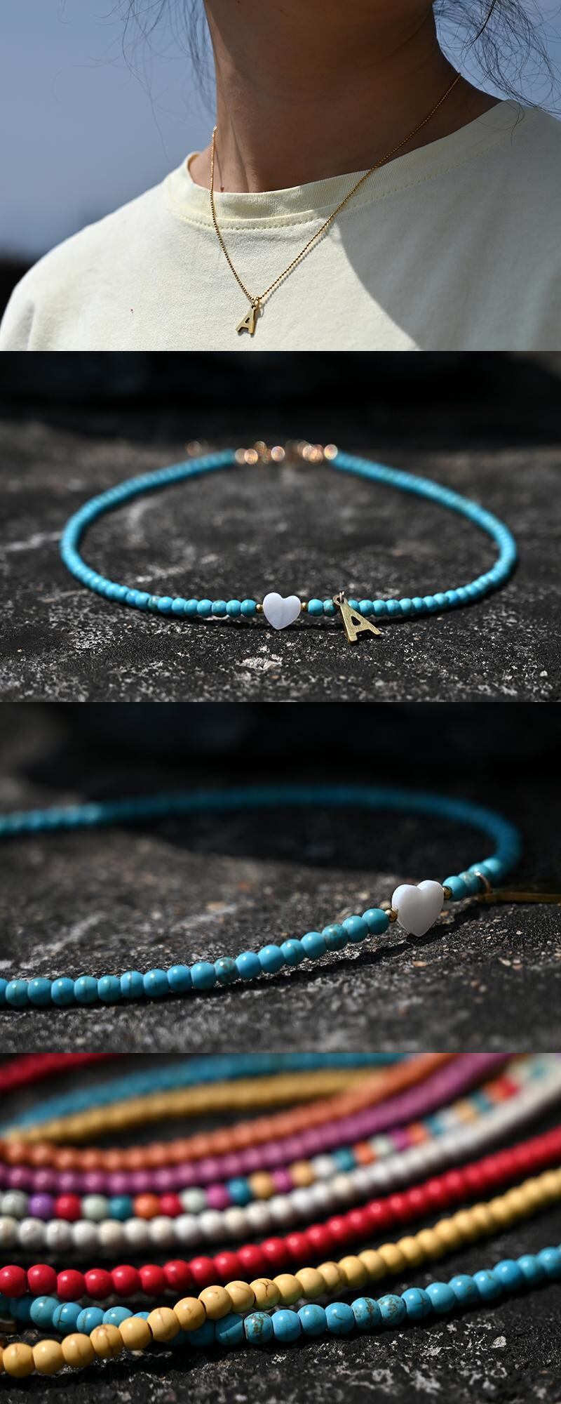 送料無料 カラフルなビーズイニシャルチョーカー女性ステンレススチールレターペンダントネックレスシェルハートジュエリー自由奔放に生きるアクセサリー レース アクセサリー AE665587286490419