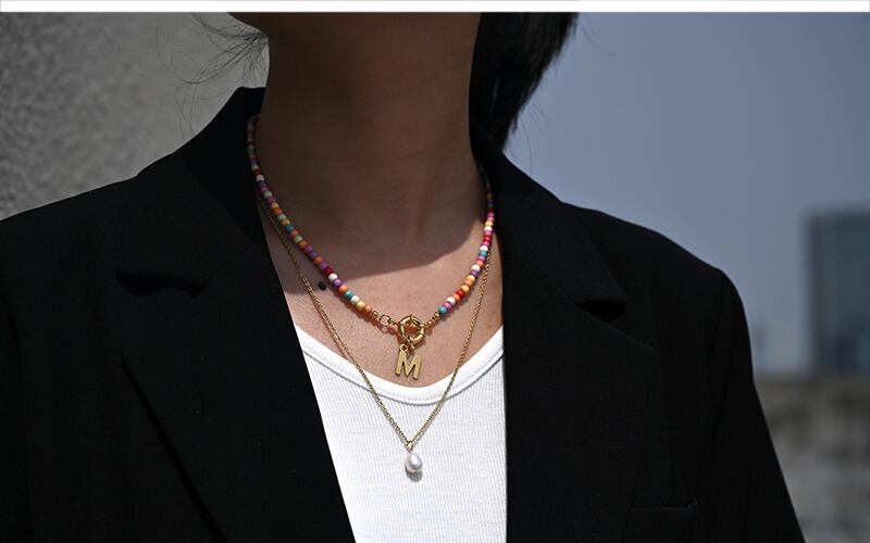 送料無料 カラフルなイニシャルレターチョーカーネックレスレディースゴールドカラーステンレススチール淡水パールペンダントネックレス レース 真珠 アクセサリー AE665573476342395