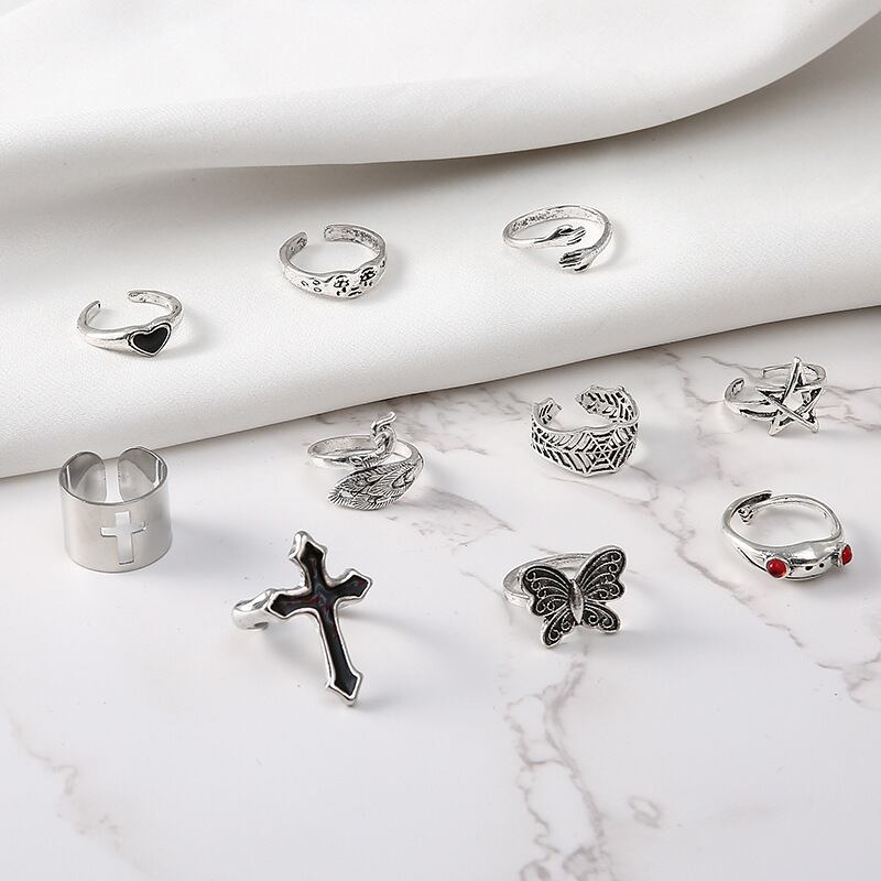 送料無料 LATSヴィンテージシルバーメッキクロスリング女性ゴシックパンクスチームパンク泣き顔バタフライフロッグリングセットパーティージュエリー 指輪 銀 ビンテージ アクセサリー AE332221114955110063